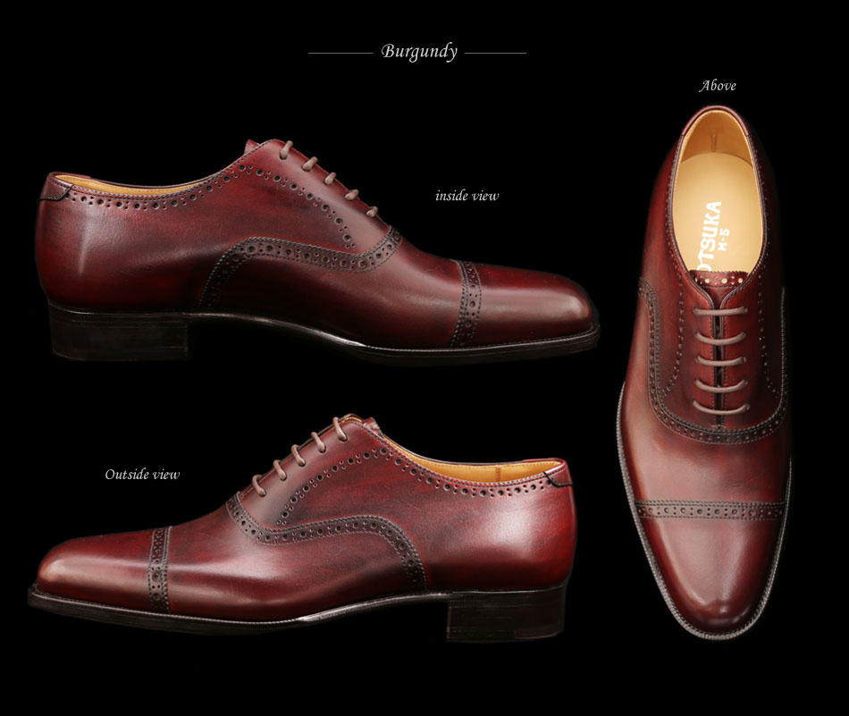 デザイン:7アイレットの外ハトメ、外羽根、Punched Cap Toe でメダリオンあり Cap toeは気持ち小さめ 木型:5722 製法:ハンドソーンウェルテッド製法 九分仕立て アッパー:赤茶~バーガンディのスムースレザー(外ハトメは革とできるだけ同色) アウトソール:革底ツートンカラー(半カラス) / ヒドゥンチャネル / 縁焼き加工 ヒール:ピッチドヒール