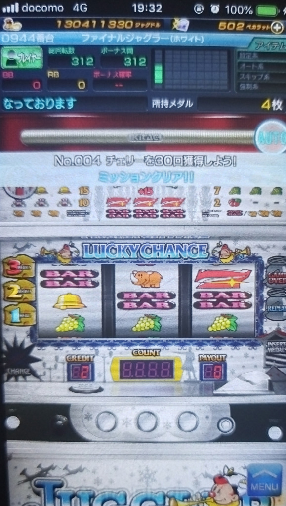 今日の夕方チェリー30回ミッションがあり、いつもは初代でクリアさせていましたが、今回初めてファイナルジャグラーでクリアを試みました すると… 0から回して312回転でクリアしたのですが、これって遅いですよね? 体感ですが、初代なら余裕で300回転以内でクリアしていたような… 初代とファイナルジャグラーのチェリー出現率って明確な差があるのかな? とりあえず私の今後のチェリーミッションは初代でクリアしたいと思いました