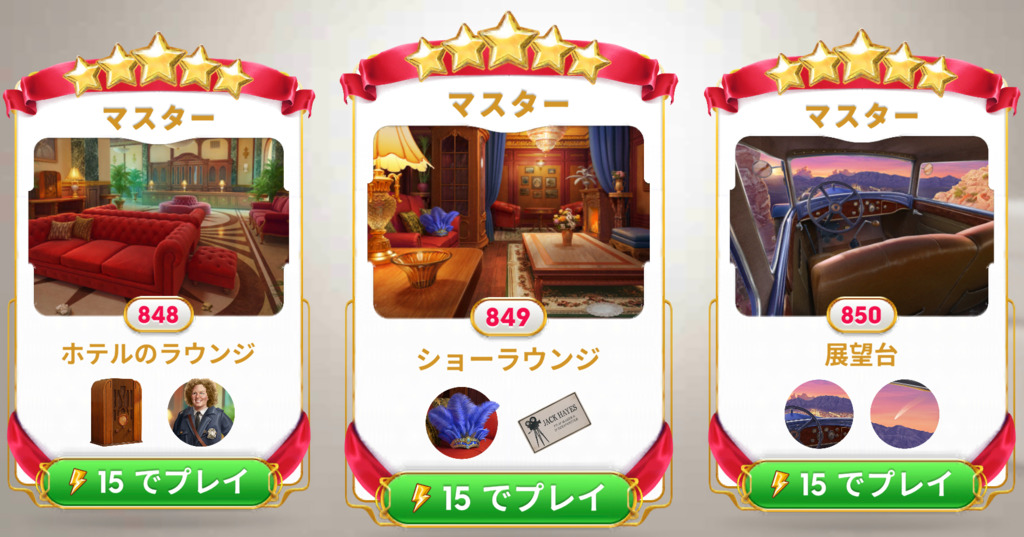 849 ショーラウンジ…控え室?、中央にテーブル(花瓶)、奥にシャンデリア、複数の額縁、青色カーテン、、向かい合う赤色ソファー、左テーブルにランプ