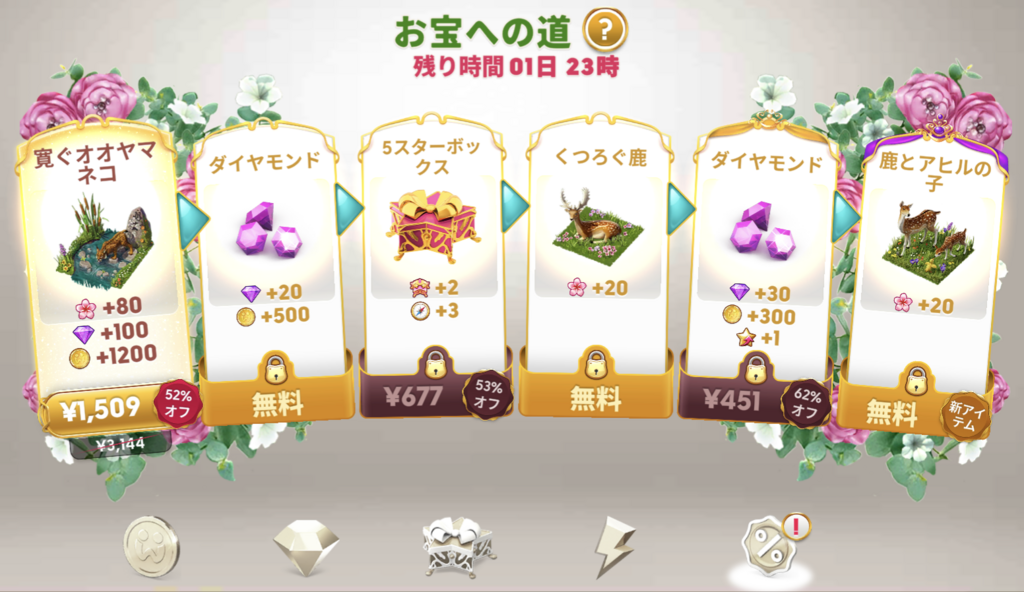 くつろぐ鹿は以前171💎で買ってました🦌(しかも2頭…😅) ダイヤ、コイン、赤箱、コンパスの必需アイテムにカワイイ動物たちがついてきたと考えたらありあり🐜🐜なお買い物でしたね〜 私の島ではトータル5000円パックだったので諦め…😅