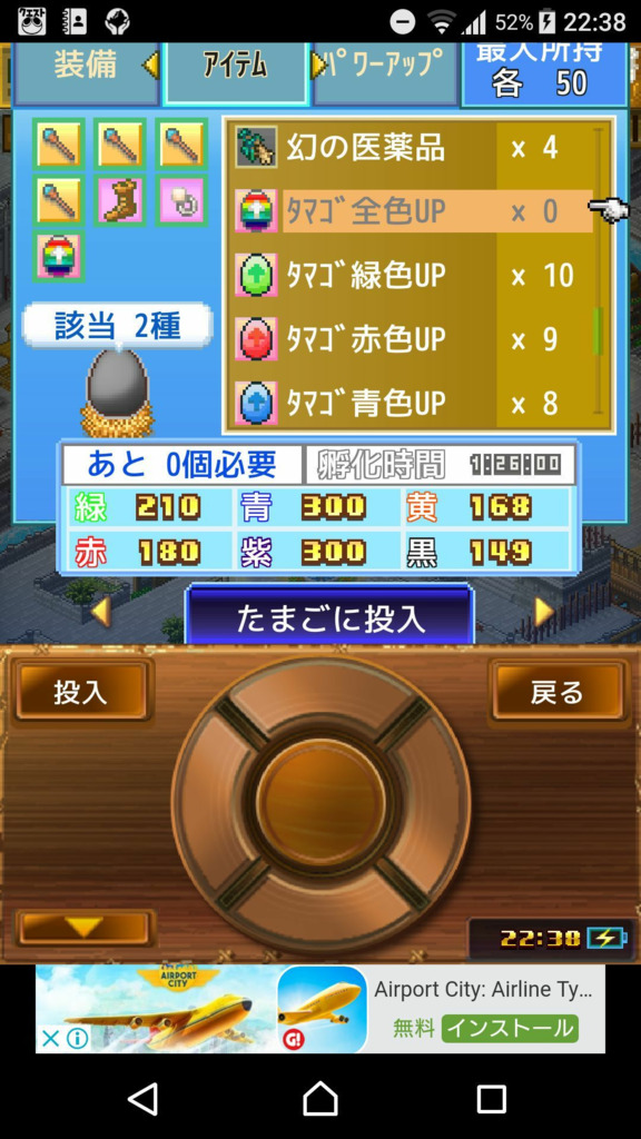 緑91 青200 黄0 赤209 紫99 黒0 これだと該当1種になり、タコンパス改は孵化しませんでした。
