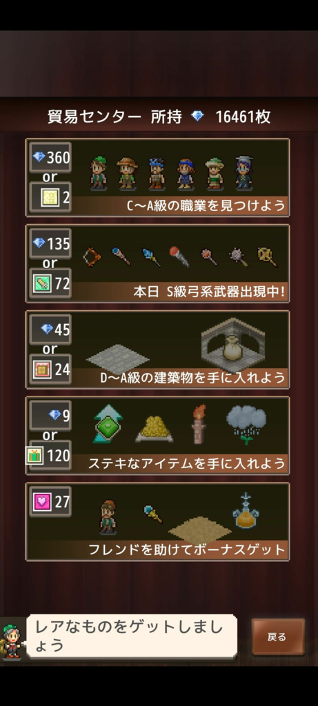 【S級 商人】 ▽1Lv毎の上昇値 HP+12 MP+5 元気+9 攻撃+4 防御+3 早さ+3 運+3 頭脳+5 器用+4 採集+3 移動+4 ハート+5