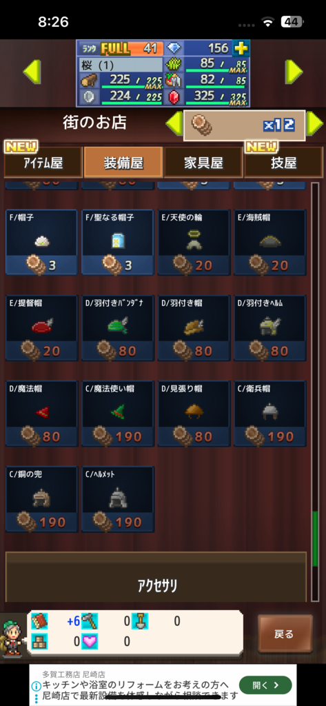 C/魔法使い帽ですが現在防具屋21で発見となっていましたが、19でも発見出来ました。(頭脳は1400で今の情報提供より高いです。)