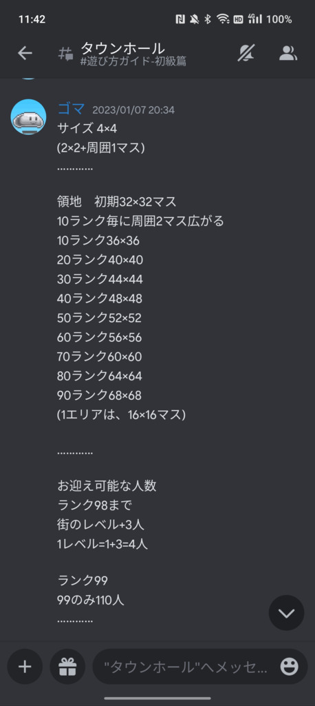 数え方が間違っている可能性があります。 余談ですがマスを数える際は柵や道で計算すると楽です。 ランク34の段階で44×44ですので奇数になりません。(添付画像ご参照下さい) 逆算すると初期で32×32マスです 引用元の過去ログは2マス広がると記載してありますが、片側しか計算に入れていませんので間違っています。 この辺りはDiscordにて改めて情報の更新をしておりますのでお気軽にご利用下さい。