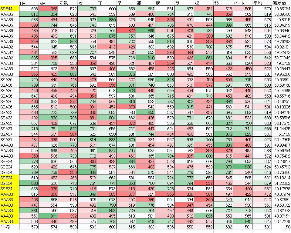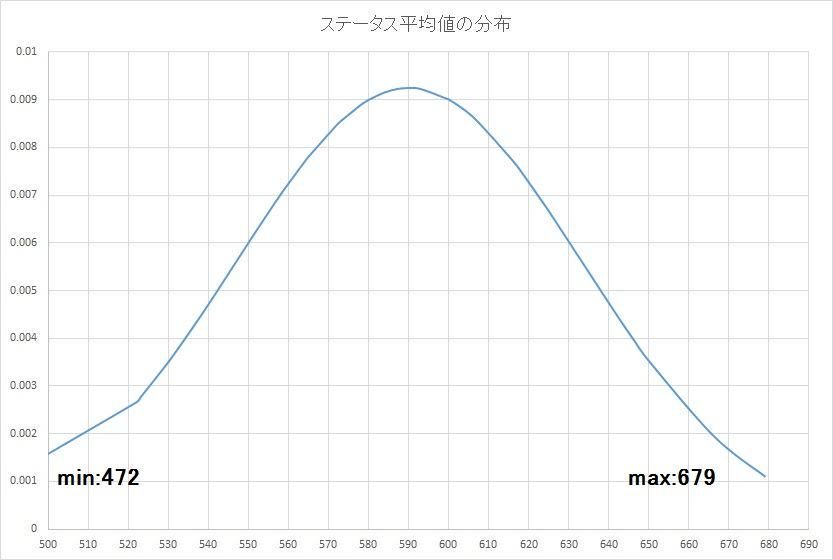 全ステータスの平均はLv590であり、最大値はLv679、最少値はLv472まで誕生しました。