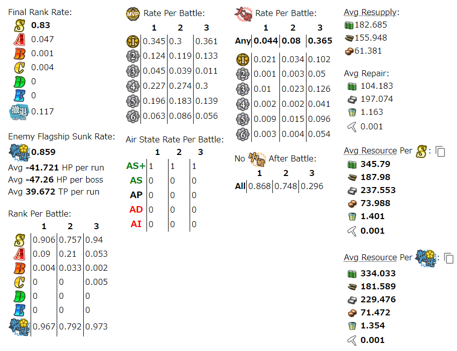 今、適当にKanColle Sortie Simulatorに入れてやってみたけど、Sは何%、Aは何%...ってのは出てくるけど、それであってる? 「出撃あたりの最終評価」って欄
