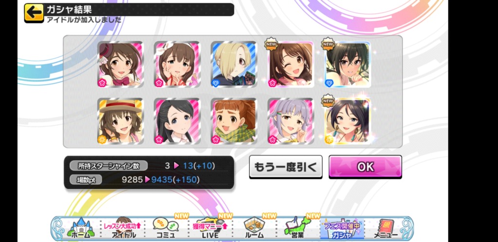 【かんむ/デレステ】1週間ぶりにINしたらフェス中だったので、10連引いてみたけど、良い結果が出た。これは冬イベがスムーズに進められるというお告げなのでは....!