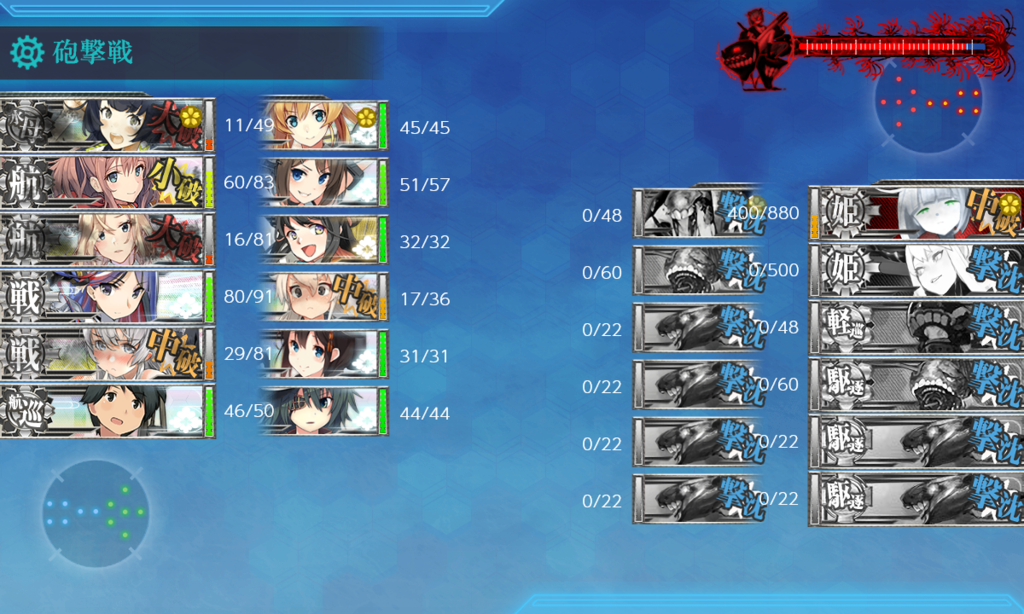 (´・ω・`)そのようね まあ耐久800もあるとはいえ装甲200だし1隻ならなんとかなるかな……? 基地3部隊全部集中させようかな