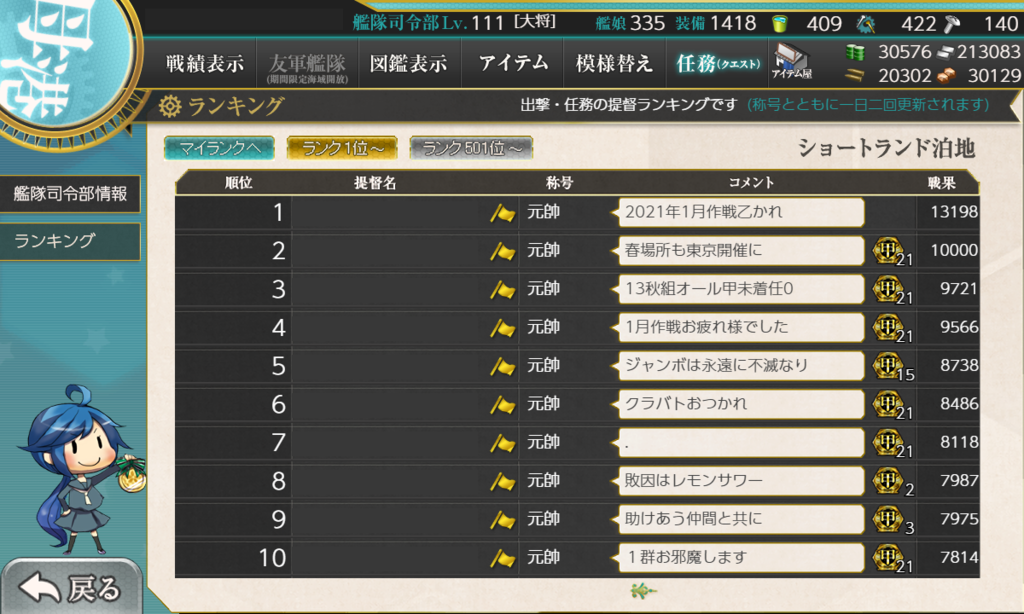 今月は節分任務をこなしつつ、5-5までを割って終了。戦果が約2100で1000位ちょっと、500位の戦果が約4000。ランカー勢ってのはすごいもんだなぁ…