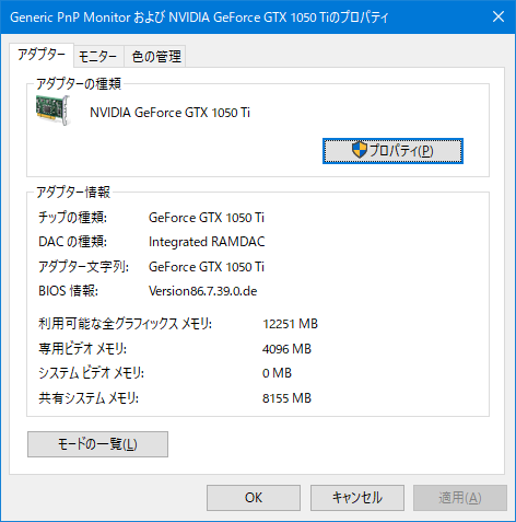 Win10だと、「設定」→「システム」→「ディスプレイ」→「ディスプレイの詳細設定」→「ディスプレイ1のアダプターのプロパティを表示します」の順に選択すると、以下のような画面が表示されるので、そこで確認できます。