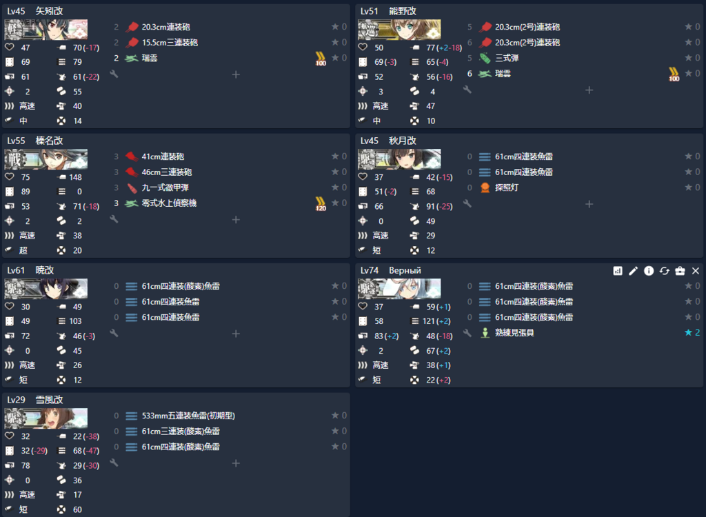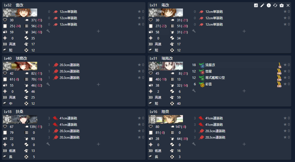 これくらいのLvと装備感だと近代化改修がいきわたっているか不安なところです。火力・雷装が低いと突破できるものもできないし、装甲が低いと余計に道中撤退しやすくなります。秋刀魚漁ついでに近代化素材を拾い集めて投入していくといいかも。