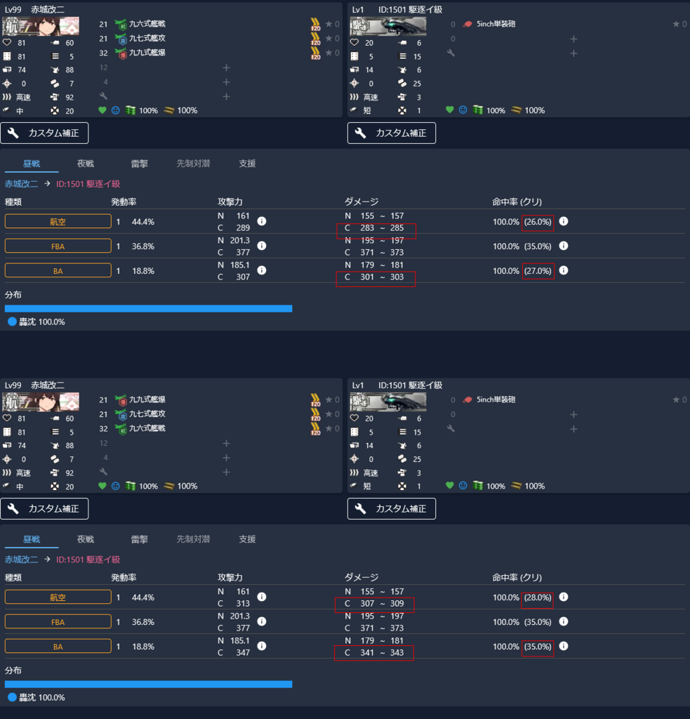 あ、すいません。自決しました。専用ページに「装備ボーナスによる火力上昇 は有効だが、命中値上昇は無効。」と書いてありました。無効なんですね……。