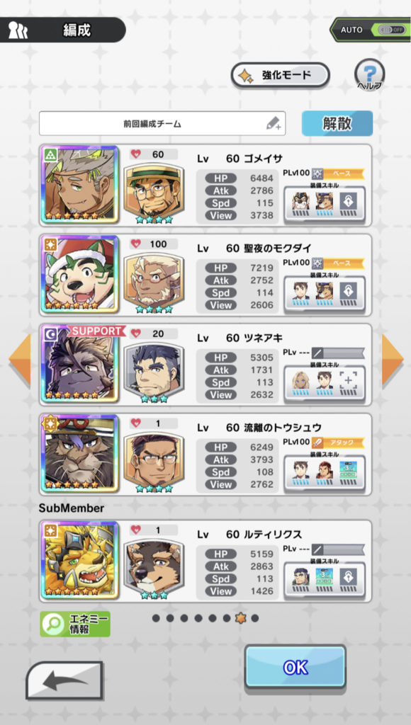 限トウシュウでゴリ押そうとしてもミリ足りず、6T目のボス全体が超えられない~。ピンチ度のお供のSPD↑もいやらしい。沈黙無効だからボスのスキル3は過消費かATK↓、無敵集約、限ゴメイサのスキル3あたりでクリアってことなんだろうけどそうすると火力がきつい。たぶんスキル的にATKDEF↓に過消費持ちツネアキ接待だとは思うんだが、ツネアキがまたもろいんだわこれが。