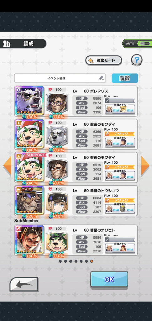 この編成いいですね。早速活用させてもらいました。今回のボーナスキャラに限定トウシュウがいるので、見事にはまりますね!