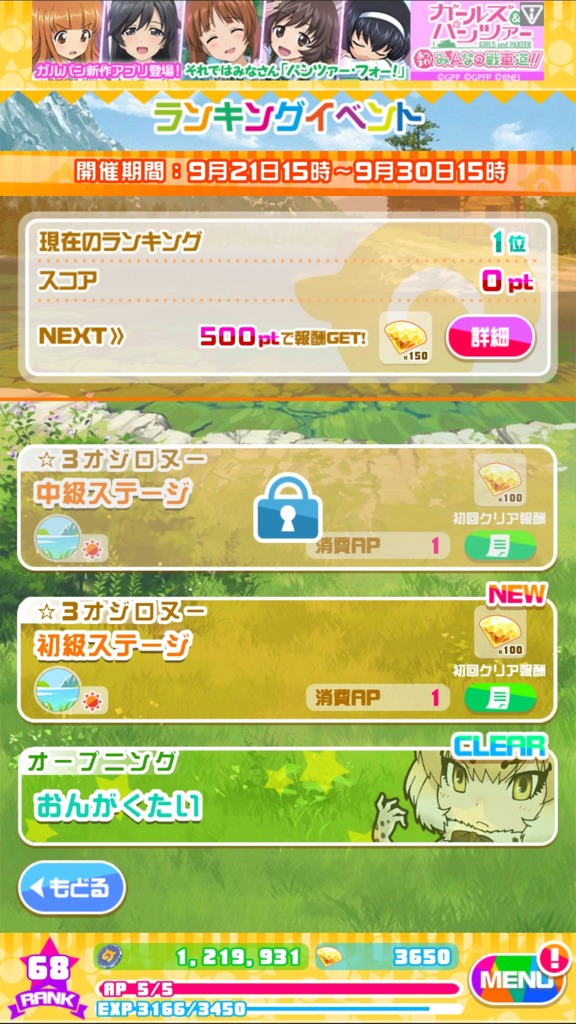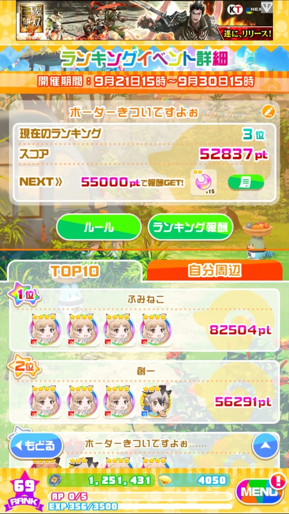 開始直後に各クエスト1周ずつ+超級1周→ランクアップAP回復→超級5周 でも最初の一瞬以外天下取れなかったよよよ