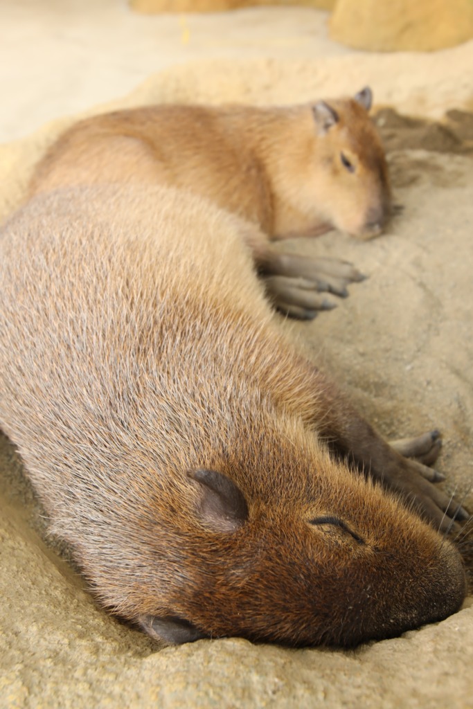 寝ているカピバラ可愛いですね。どれも素晴らしい写真です。(まさにプロ級)