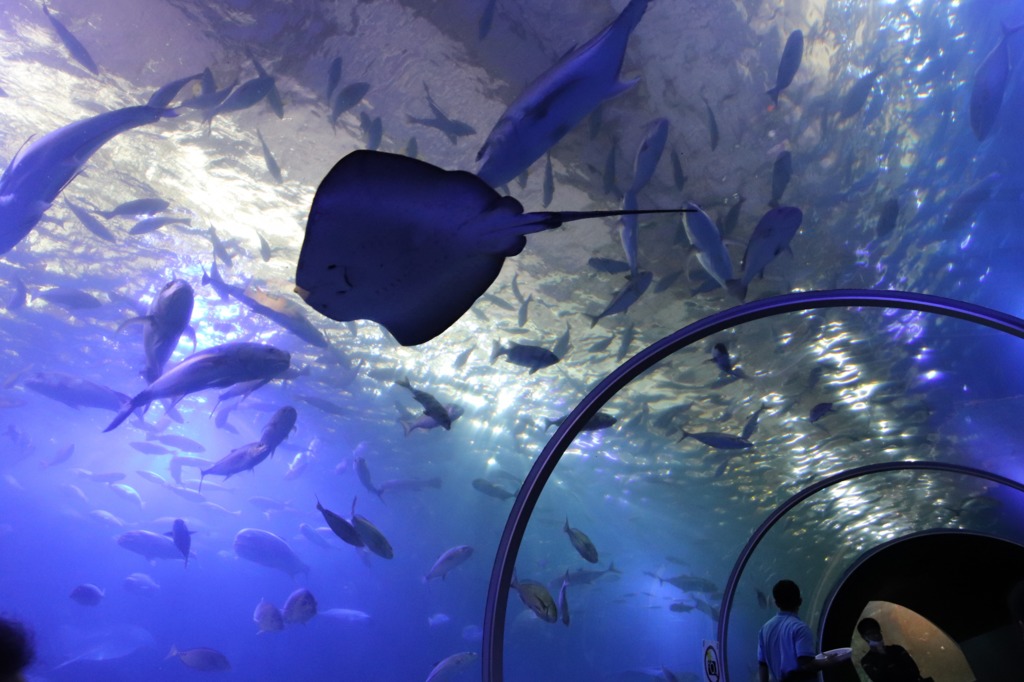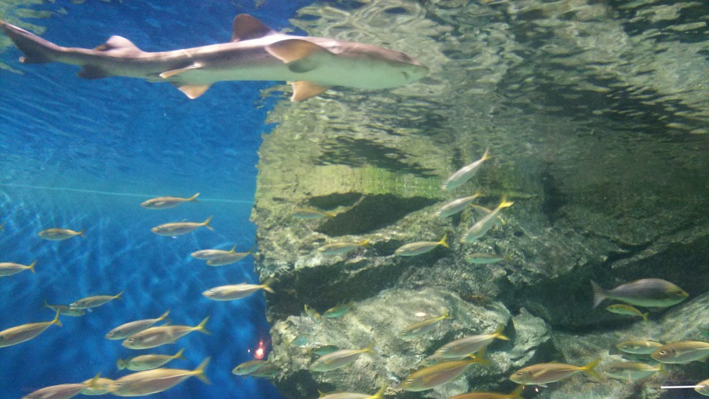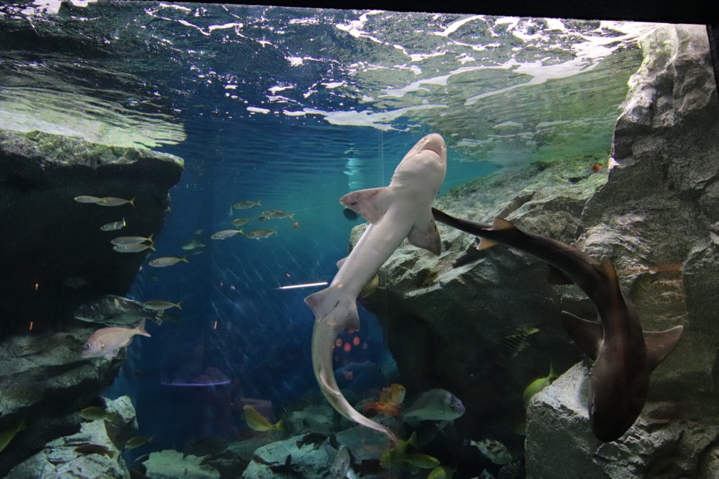 巨大な水槽の中を泳ぐサメやエイや魚の群れ 水族館の定番ですね