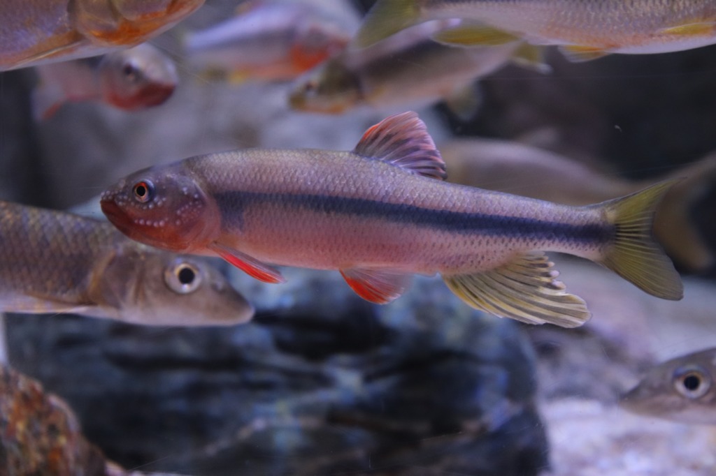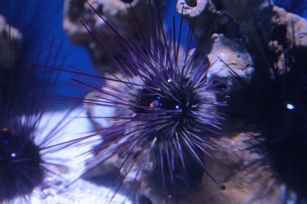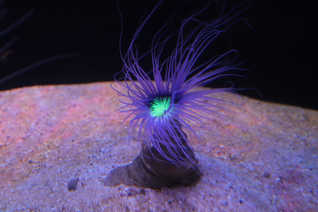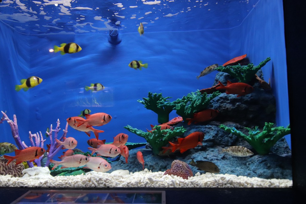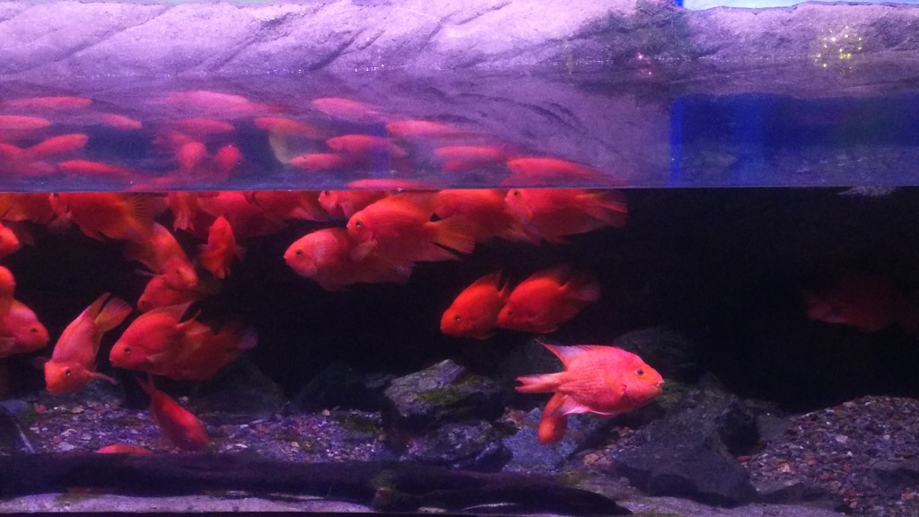 照明が青くなると一気に魚たちが見えにくくなります。赤い光の届きにくい深海では、赤い体色は保護色となるそうです。深海の生き物に赤いこが多いのはこういうことなのかな?