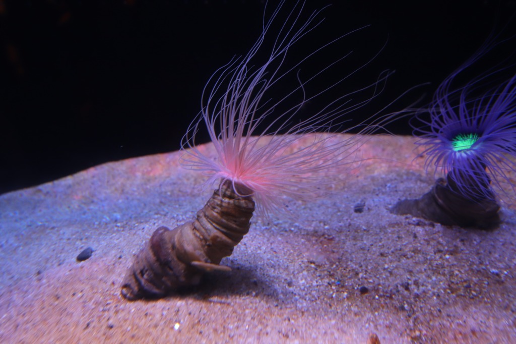 エビちゃんです。たぶんボタンエビです。ちっちゃくてスケスケでかわいいです。食用として身近なエビですが、実は深海に住んでいるんですね。赤くてスケスケってのも保護色として役立つのかもしれません(正確にはお寿司屋さんなどに並ぶのはすこしちがう種なのだそうですが)。ボタンエビも成長で性別が変わるんですね。