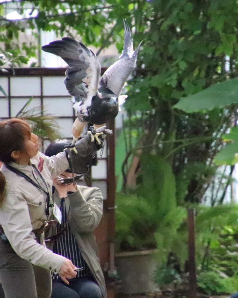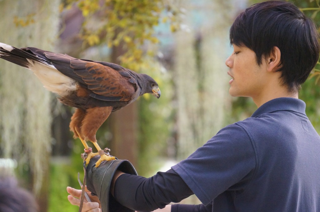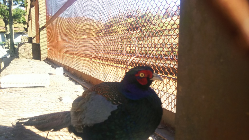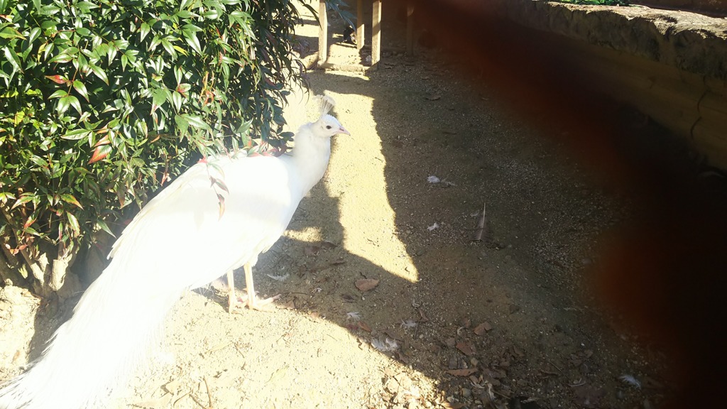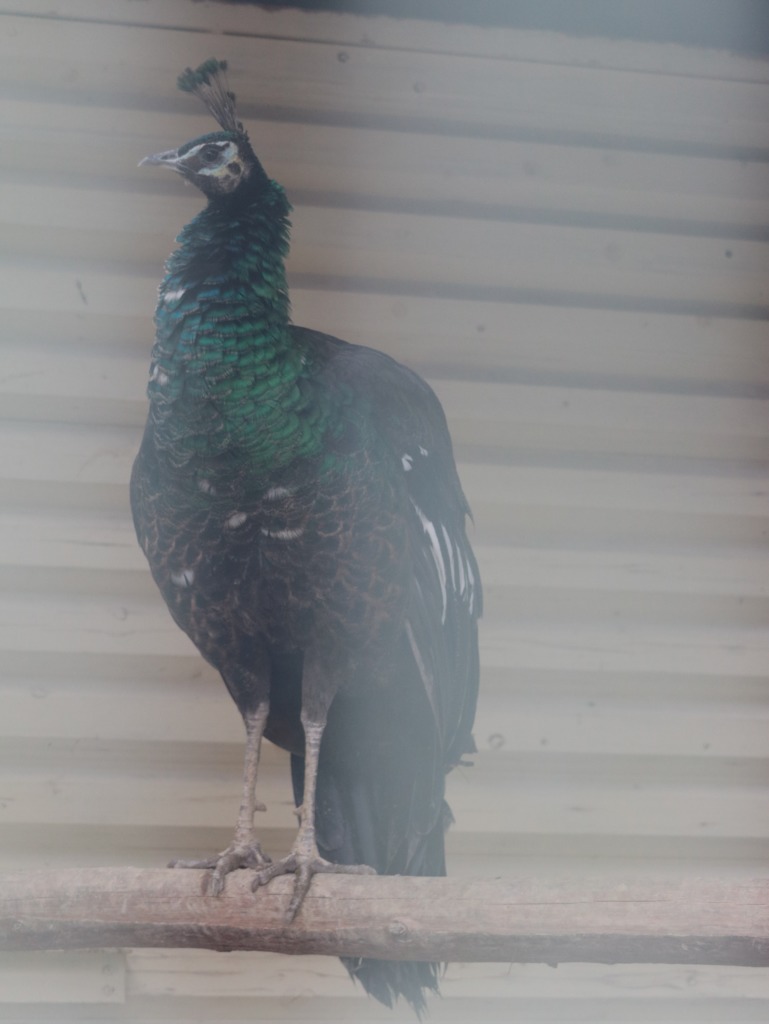 ハヤブサ。意外と可愛い顔。孔雀は羽の生え変わり中ですかね。