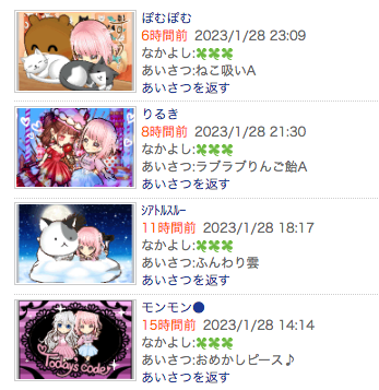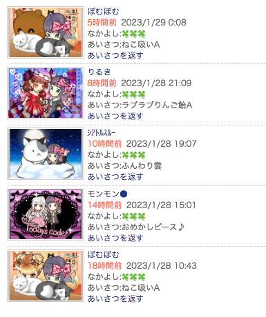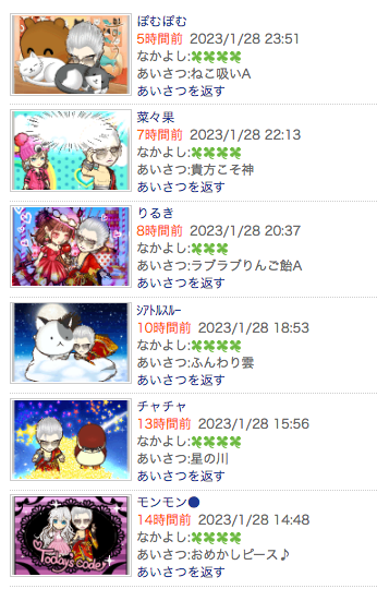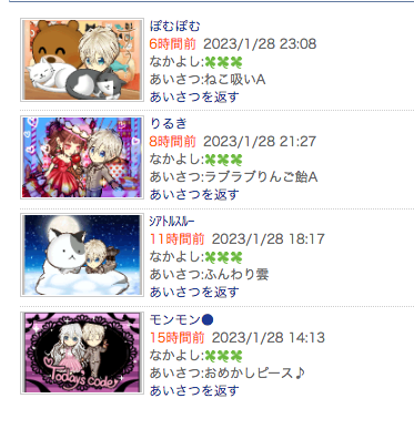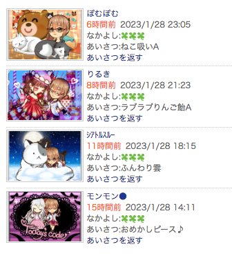 この状況は現在もりるき一派のあいさつ履歴から親密度の低い相手を抜粋すれば