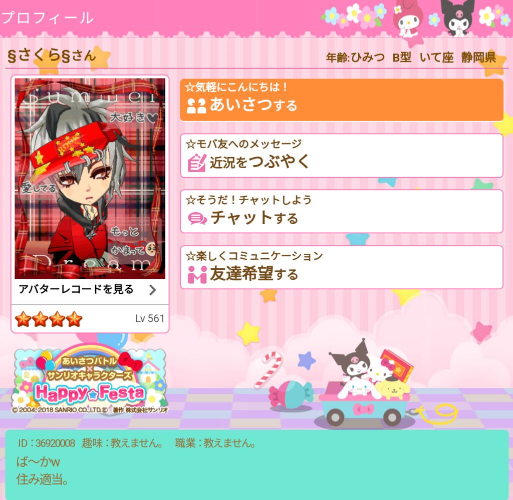 §さくら§ほんとキモイ! 不正入選無課金アバなんでしょww もっとマシなアバにして欲しいな。 どこにでも足跡!キス挨拶!きもアバからのキスなんか要らんし!