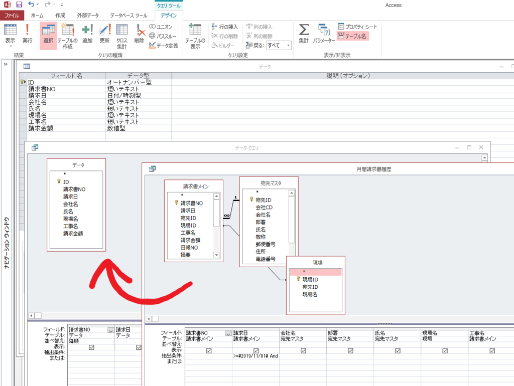 ”データ”テーブルはあります。ただ月間請求書履歴のクエリの中には”データ”テーブルの情報はありません。