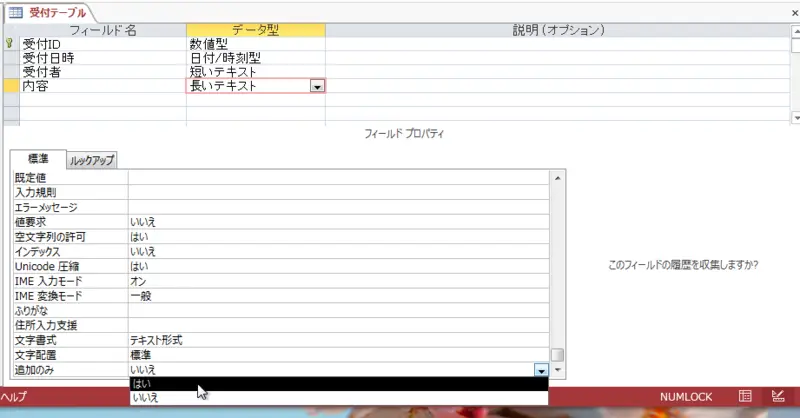 テーブル「データA」の主キーのフィールド名はIDとデータ型はオートナンバー型です。