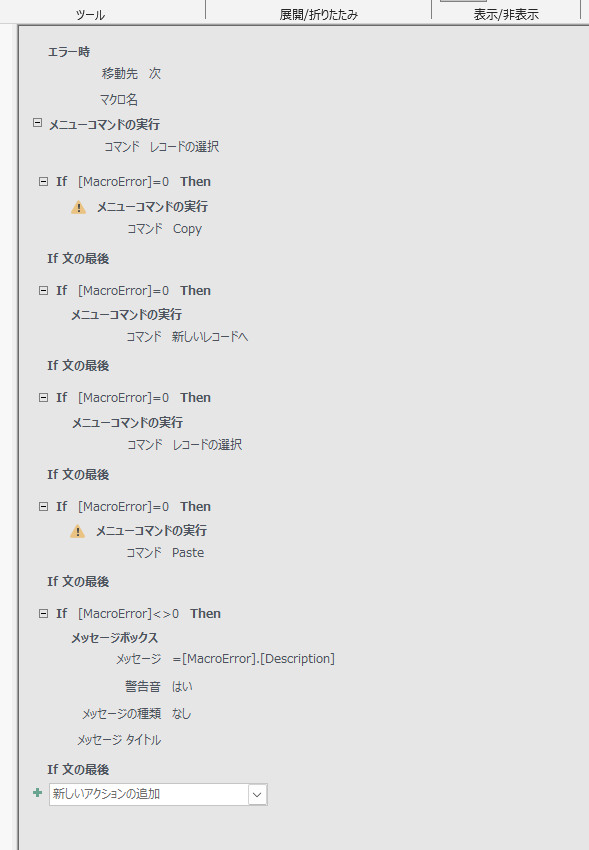 お世話になります。 フォームに配置したレコードの複製ボタンが、先月ぐらいから突然使えなくなりました。 新たにコマンドボタンウィザードからレコードの複製ボタンを作りなおしても見ましたが、やはり 「コマンドまたはアクション"貼り付け"は無効です」というメッセージが出ます。 埋め込みマクロの中をみると、図のようにcoppyとpasteのところにビックリマークがついていますが、意味がわかりません。 ちなみに、Ctrl+CとCtrl+Vではコピーが出来、重複なしにしているIDもきちんと連番になっています。 どこを調べればいいのかさえ分かりません。よろしくお願いします。