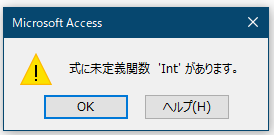 その後フォームを開こうとすると、「式に未定義関数 'int' があります。」
