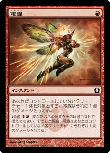 超過(1)(赤)(あなたはこの呪文をその超過コストで唱えてもよい。そうしたなら、電謀はあなたがコントロールしていない各クリーチャーにそれぞれ1点のダメージを与える。)