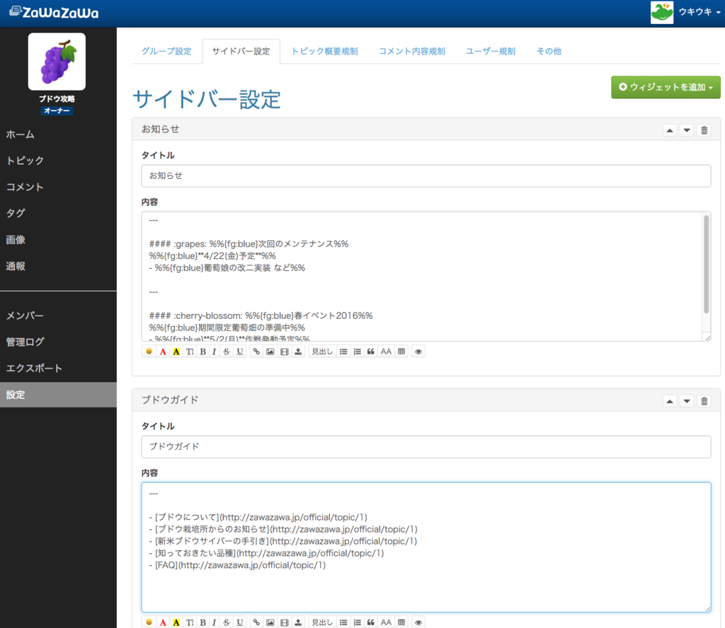グループ管理ページの「設定」に「サイドバー設定」を追加します。 ウィジェットとして追加、自由形式にて編集することができるようになり、 トピック情報は概要の右下、閲覧数などは上部に移動します。