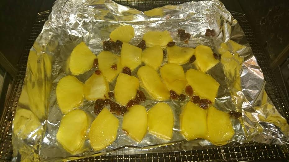 1.ホイルをオーブンに敷き、切ったりんごを並べる 2.ラム酒と砂糖をムラなくかける 3.レーズンバターを等間隔に配置 4.オーブンで、バターが溶け、りんごが狐色になるまで焼く 5.完成(刻んでバニラアイスに混ぜたりするとおいしい