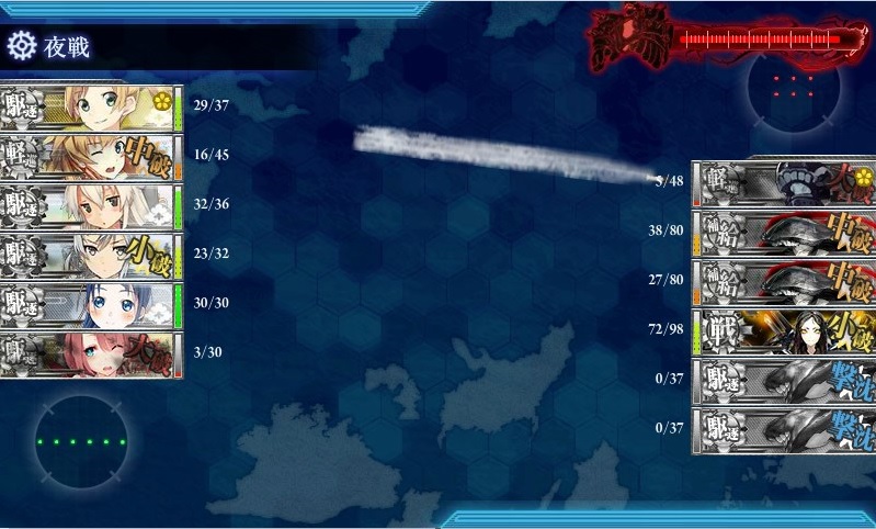 舞風 :My little princess. 阿武隈:瑞鶴を外し、下ルートに切り替える形で指名。3-5に出すのは初めて。 島風 :阿武隈さんを指名する事で索敵値が不安になり高性能な彼女を指名。春イベでも頼りにしています。 野分 :4巡でも残っていたので指名する他無し。駆逐艦で2人目の99到達はもう少しでしょうか。 五月雨:初期艦。その長い髪の毛が素敵ですね。トリートメントはしていますか・・・? 江風 :改二決定おめでとうございます。索敵が足りないなら電探3摘みするかも。まろーん。