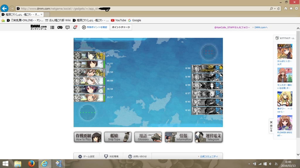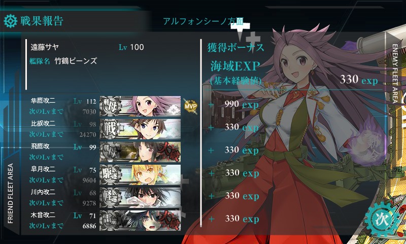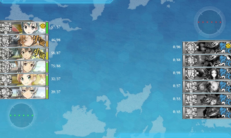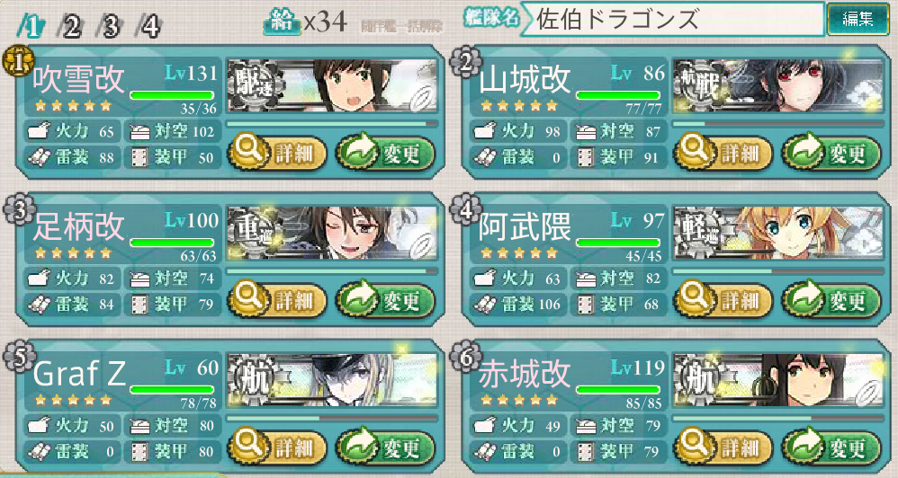 とちう送信してしまったンゴ 吹雪:嫁。防空能力の高さに期待している 山城:火力&制空要員。グラーフと赤城だけだと制空権確保ギリギリなので投入 足柄:電探要員。Fumo電探装備で渦潮の被害軽減する役割を担う 阿武隈:先制雷撃要員。阿武隈お得意の雷撃で駆逐艦撃沈や空母中破を狙う 赤城:ルート用空母要員1。空母一のお気に入りなので艦隊に入れておきたかった グラーフ・ツェッペリン:ルート用空母要員2。射程中を活かして敵艦を撃滅してくれると思う