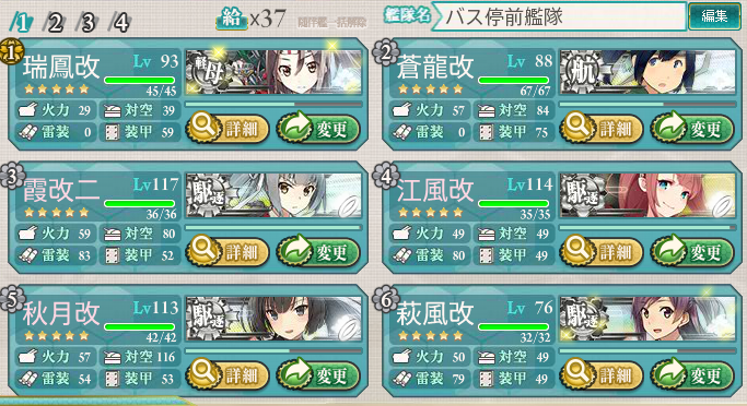 雲龍:ミステリアスさと穏やかさが気に入っている我が鎮守府の陰陽師。燃費と火力のバランスがいい。航空火力要員。 日向:物静かながらも頼りになるSAMURAI。火力&制空補助。 瑞穂:いかにも淑女然とした雰囲気を醸し出しながらも、水母では一番頼りになる優しい京美人。制空補助&甲標的による雑魚散らしを担う。 利根:アホの子呼ばわりされるけど我が鎮守府ではオールラウンダーなご意見板。晴嵐による開幕爆撃と砲撃火力補助。 龍鳳:防空艦を交渉テーブルにつかせるためにとった二枠目の空母。いらない娘じゃないぞ?制空権と彩雲、そして艦攻による随伴散らし要員 照月:開幕爆撃による被害を軽減する盾として重要な役割を果たす。