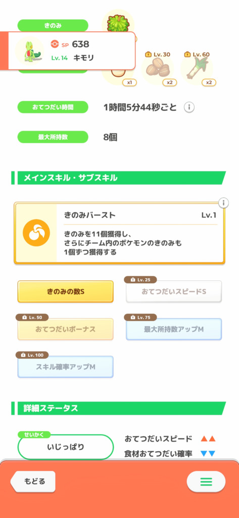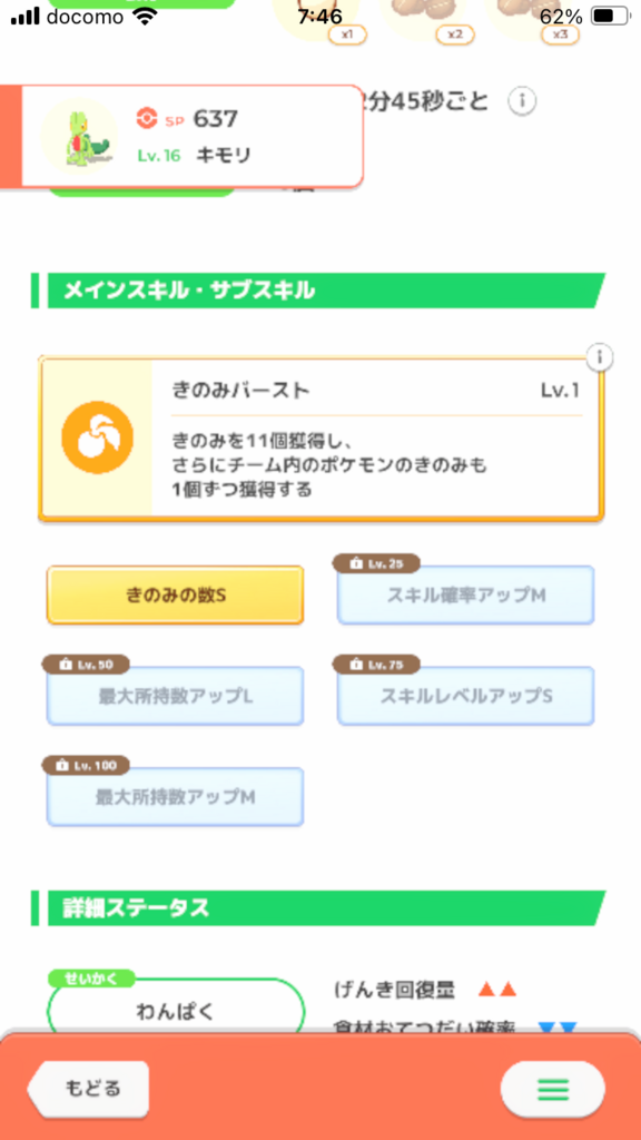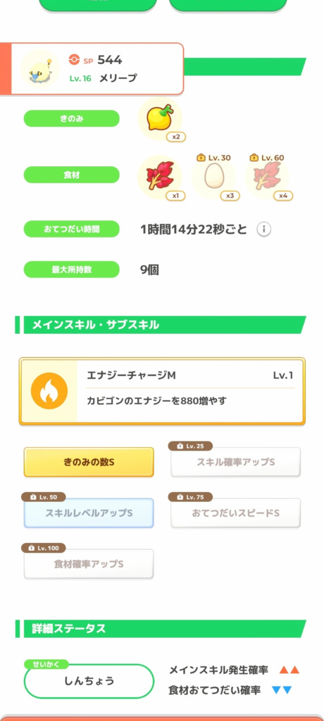 ではあるんだけど、きのみタイプってこれからどんどんレベル上げていって稼げるエナジーを増やしていくけど食材とスキルは50~60レベルで止めると思う