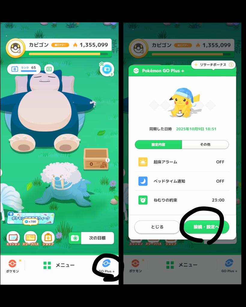計測終了後、朝ならポケモンスリープ開いた時に接続するか聞かれるはず それが無かった場合でもここから接続できるはず