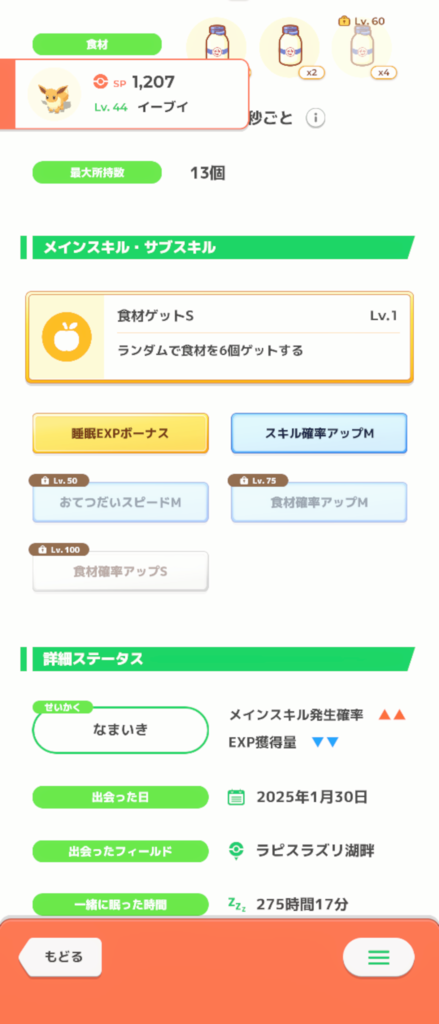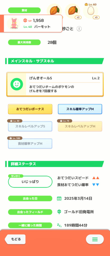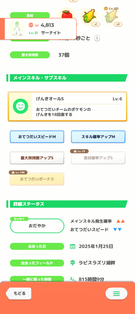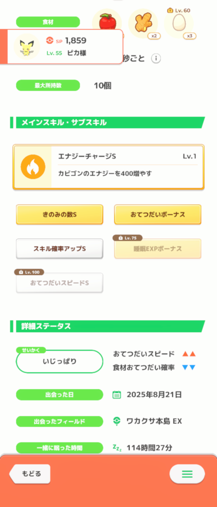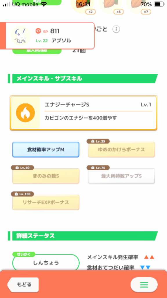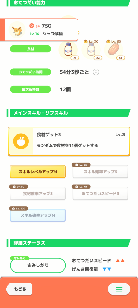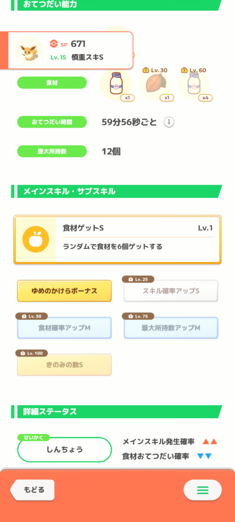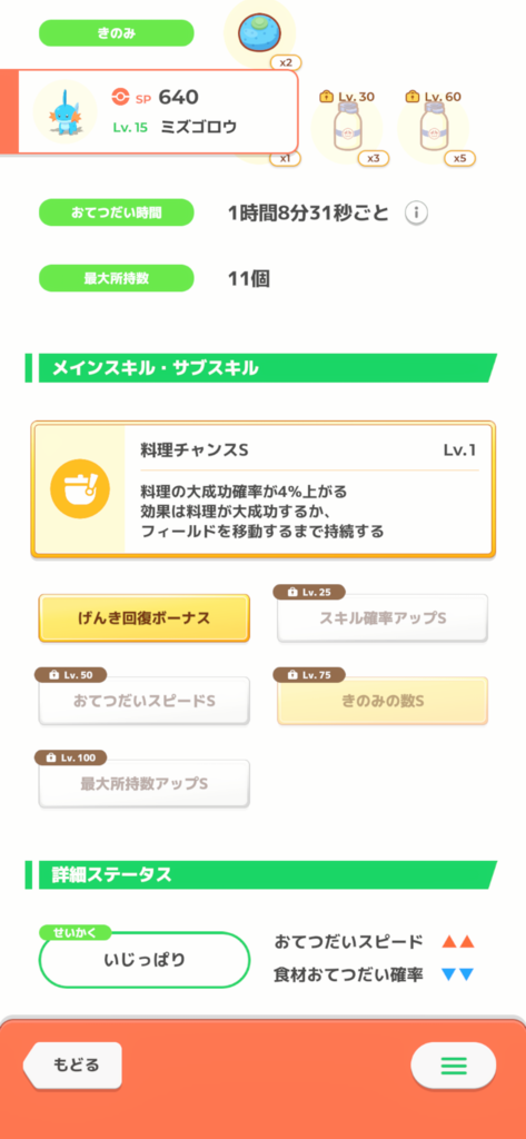 どちらもLv50にスキ確があり、違いは所持数かきのみS 鍋拡張役として任せるなら個人的には所持数付きがいいかなと思いますが、銀種を最大2~3個必要。無課金にとって貴重な銀種であり、進化にかみなりのいしも必要、Lvも上げる事になるので、個人的には多くのリソースを使っての育成には見合わない印象なので厳選続行かなと思います。