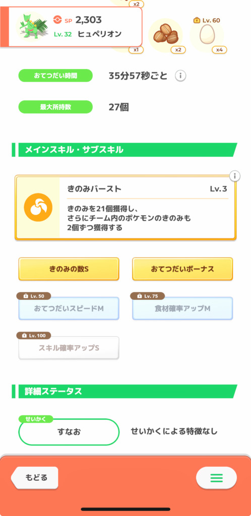 きのみ得意としてあまり強くないのでお勧めは出来ないかな コーン要員としてもLV30で16個、LV50で20個くらいでやはりきのみ得意に食材供給頼るのもやめた方がいいと思う