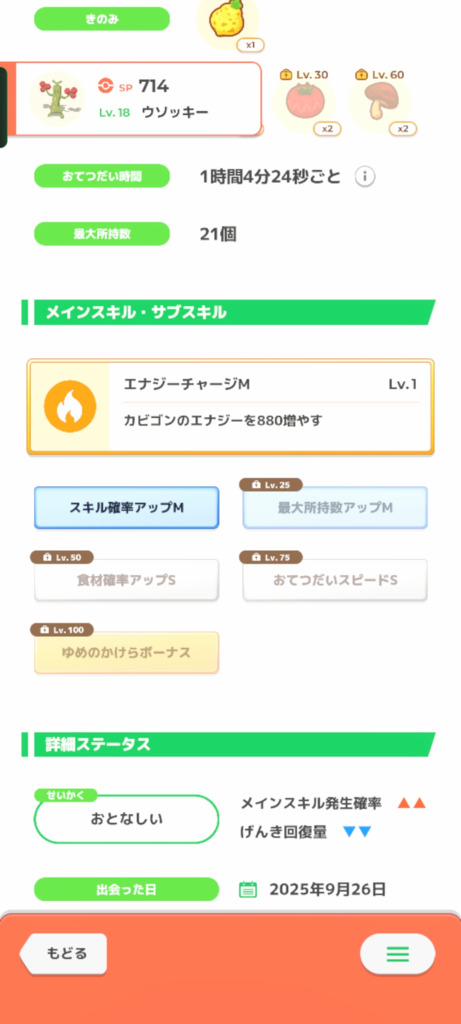 ライコウは常駐運用が多くあまり交代をしないのでげんきを維持しやすい恩恵は少ない側ですが、ヒーラーの下振れに強く、夜間のおてつだい回数が増えることでレベル差によるエナジー差も多少埋められます