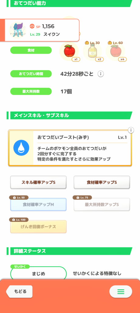 スキルタイプ:おだやか(スキル↑/スピード↓) おてスピS スキレベS スキ確S 所持数S おてスピM