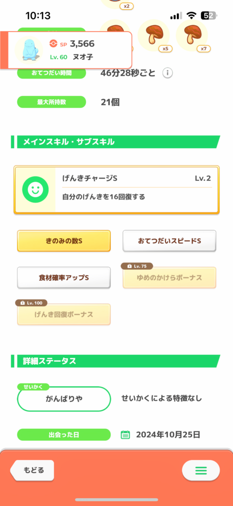 次に、75を先に埋めた方がいい場合を考えると、10と25のサブスキルで当たり(例:おてボとおてスピM)を引いた場合。こうなると、あと欲しいのは絶対に外したくないきのみの数S1点だけだから、50をひたすらガチャるよりも、75や100で先にハズレを埋めた方が急がば回れで50のきのみSを早く引ける計算になると思う(体感的には正しいと思うけど、本当にやる前に計算してね)