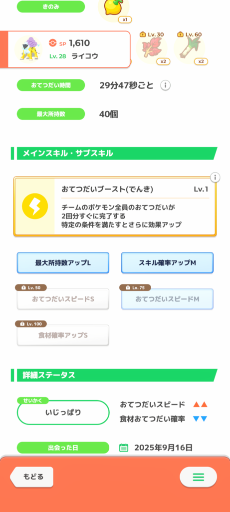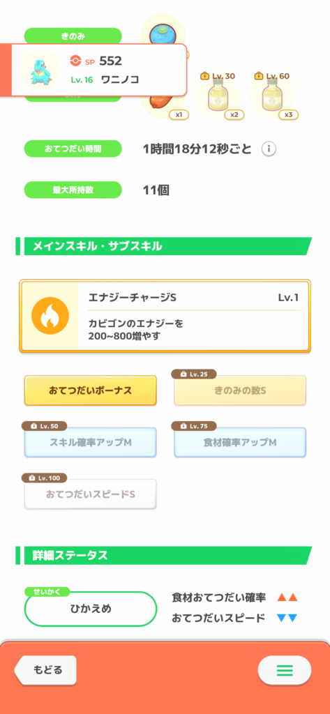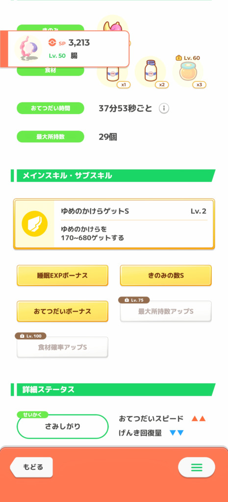 天井込みだとそのサブスキル構成のスキル発動期待値の差は0.07回ぐらいだから多分劇的な差はなさそうにもみえる 基礎のきのみエナジーとかはスピMの方がわずかに大きいし、ほぼ同格でここの部分以外全部同じのポケモンが手に入ってどっち選ぶかならスキ確Mの方選ぶぐらいのイメージ