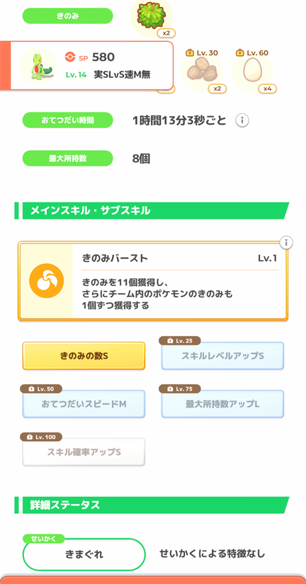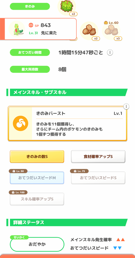 ◆きまぐれキモリの強みは金種を節約できること、74までは「おだやか」のおてスピデバフが効いているのできまぐれキモリの方がおてつだい回数が多いこと。