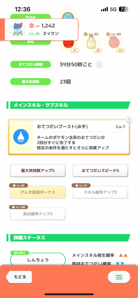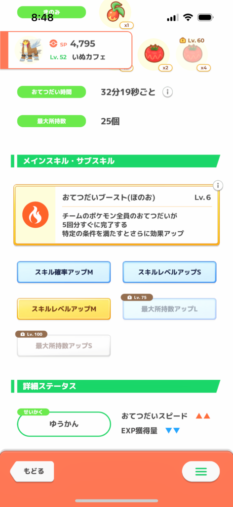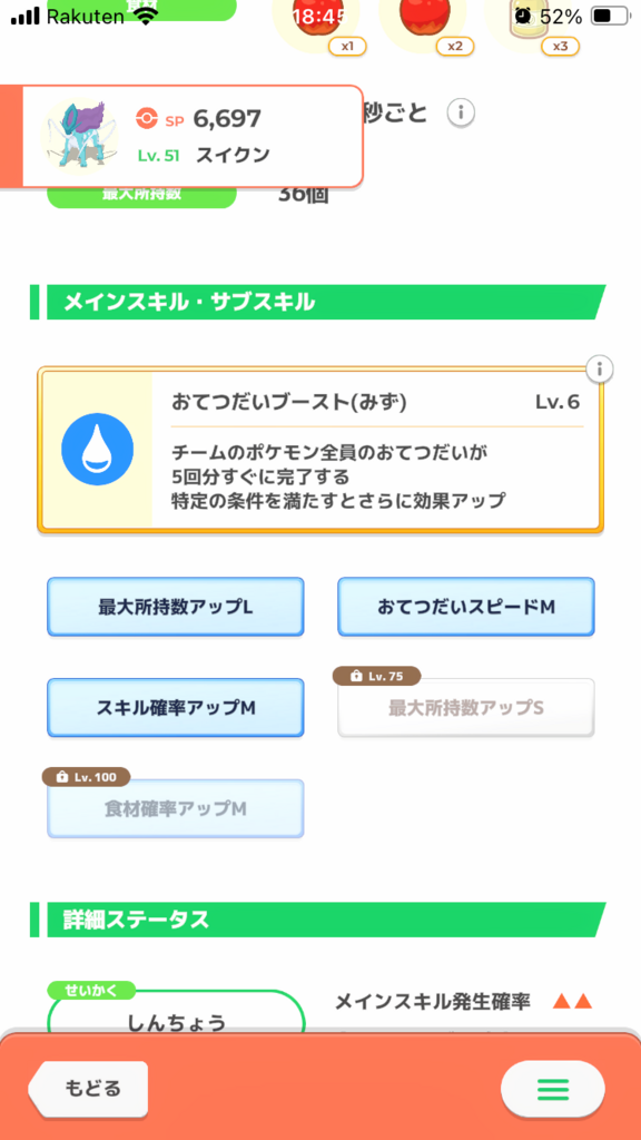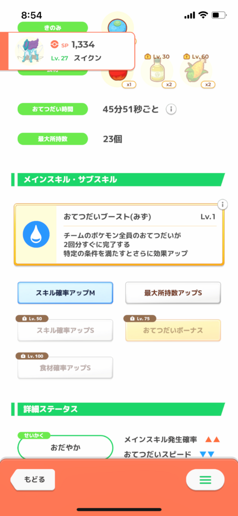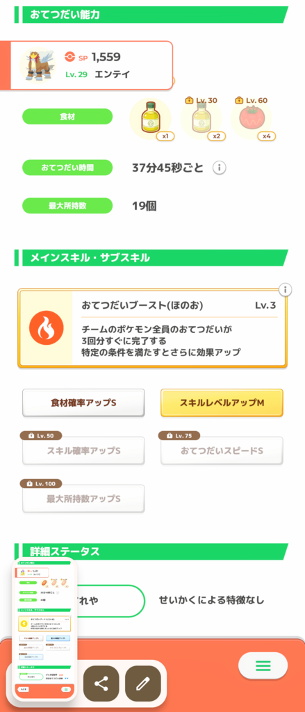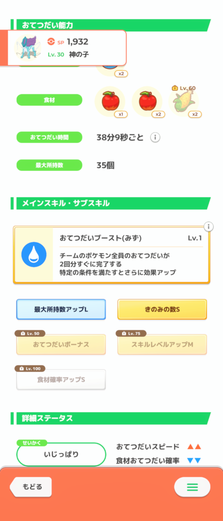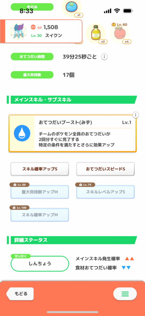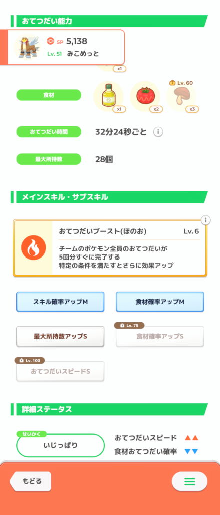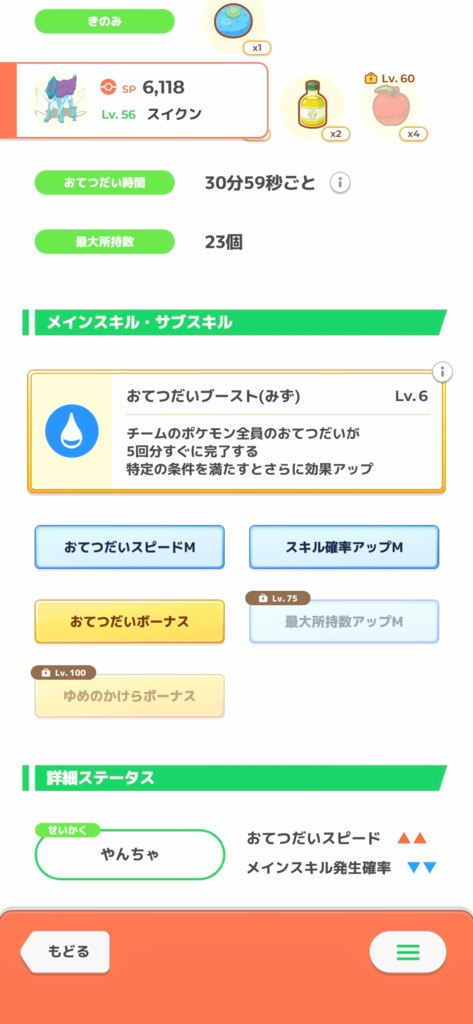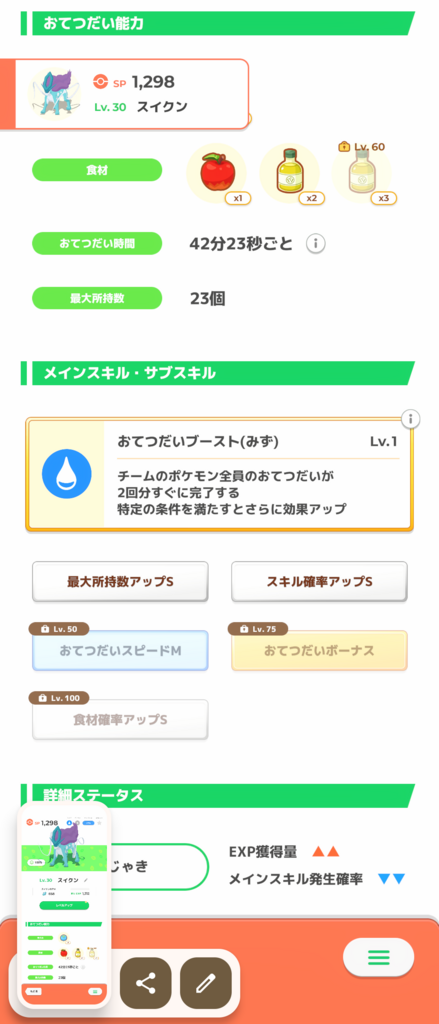 スキ確↑MS所持数のスキル特化。水の頭数足りてないのでオレン好物できのみ得意代わりに引っ張り出す感じ。今回水2でピカチュウよりは強いかな程度だった。林檎+油の料理が欲しい。Lv100のきのみSは解放できるんかしら。