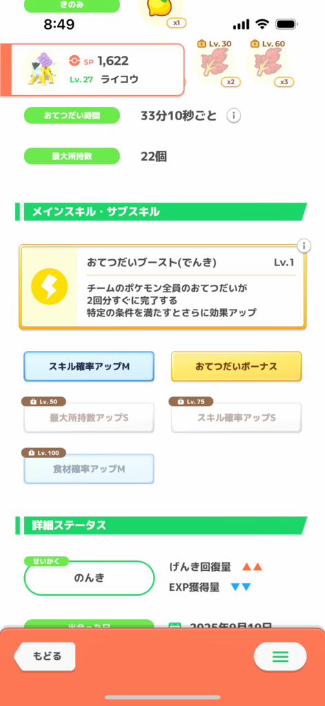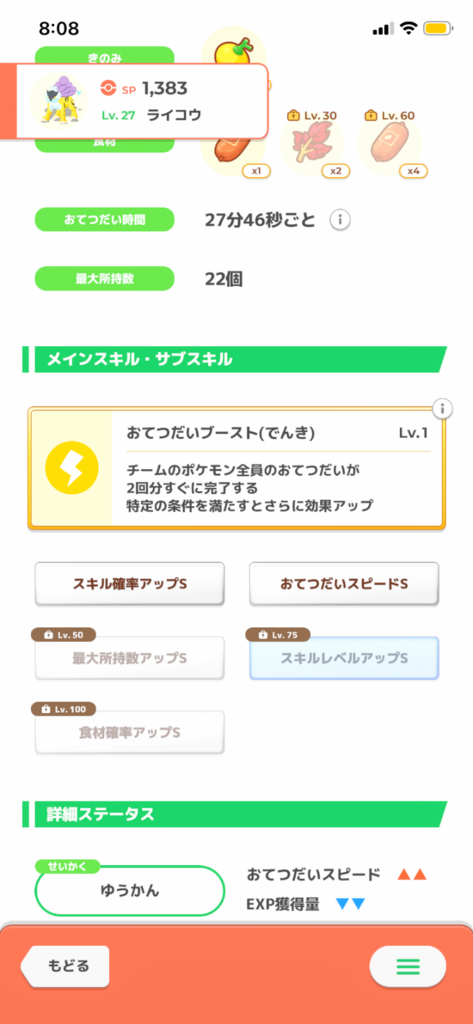 おてスピも速い+しっかり所持もある+性格スキルアップで食材AAAで個人的にはバランスが良くすべて欲しいもの揃っていたのでこの子に決めました✨今後はおてぶはこのライコウにする予定です!