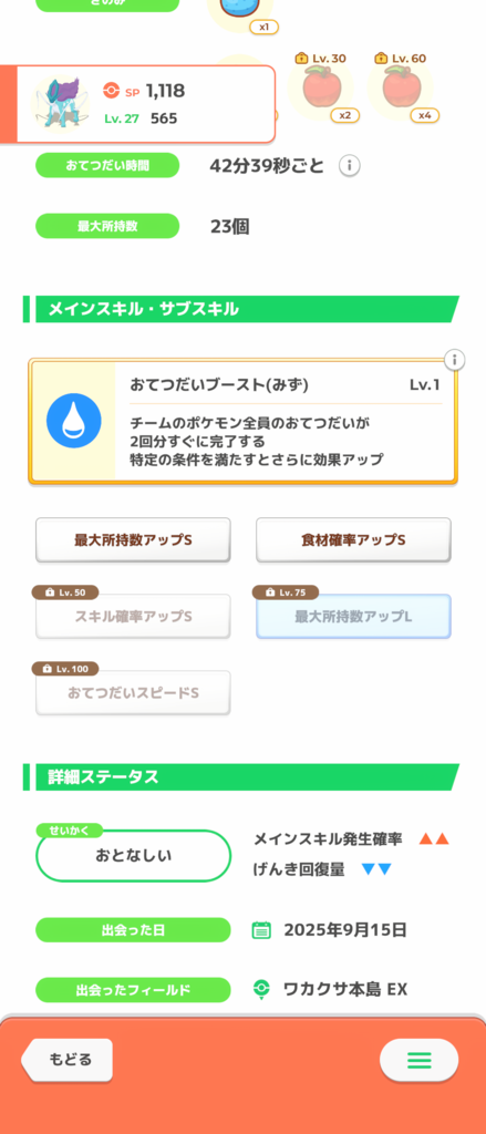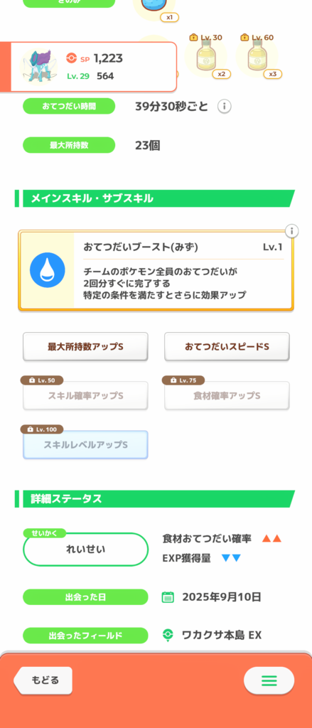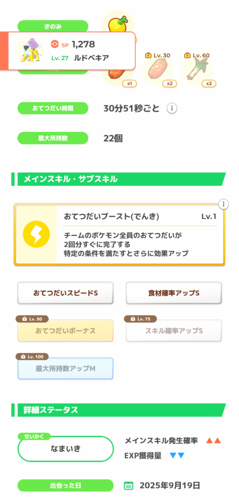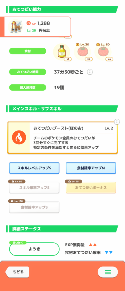 伝説のEXP↓は育成をひよる人が多いが、スキル得意は重要なサブスキルを覚えるレベル30や50まで育ててしまえば充分に強いので、レベルが正義のきのみ得意、レベル60で大幅に強化される食材得意と違って、60が遠いのは問題ない。アメを無駄違いせずにアメブのみで育成してさっさとレベル50まで上げてしまえば、51以降の育成はゆっくりで問題なし