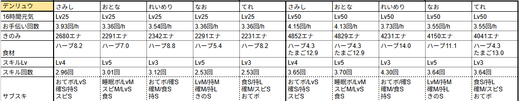 きのみ・スキルとくいは25と50で、食材とくいは30、50と60で比較してたらいつの間にかいるポケモンは全種類比較しているようになってました(いずれはEXP↓と普通とEXP↑を違うレベルで比較したい)