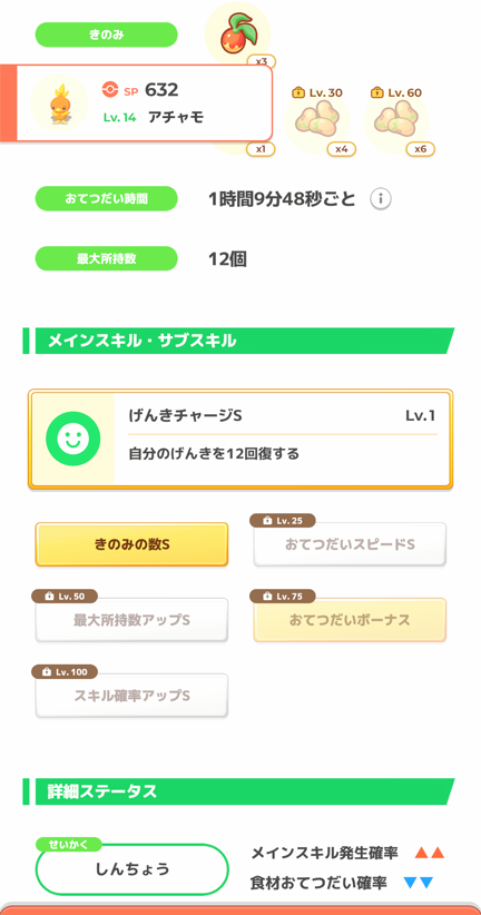 性格でも100までのサブスキルでも、食材調達性能への補正がないのもえらいし、おてスピやExp、げんきに関係するデバフを持っていないのもえらい!